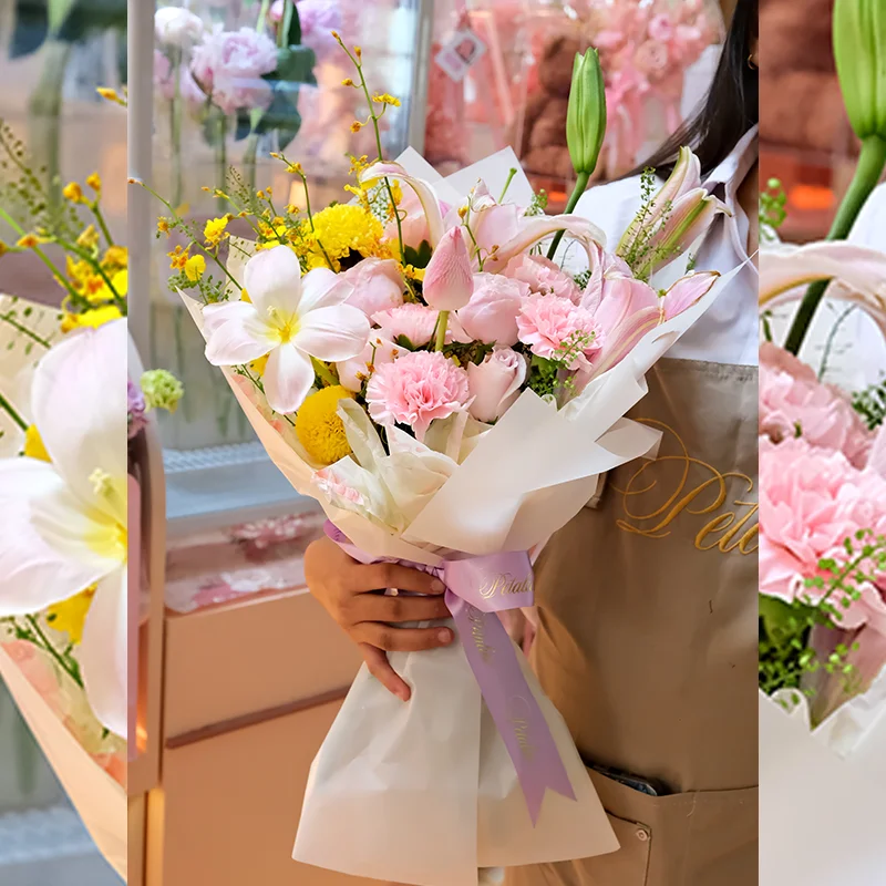 Premium tulips in soft pinks and purples with a silky ribbon wrap. Best for anniversaries.